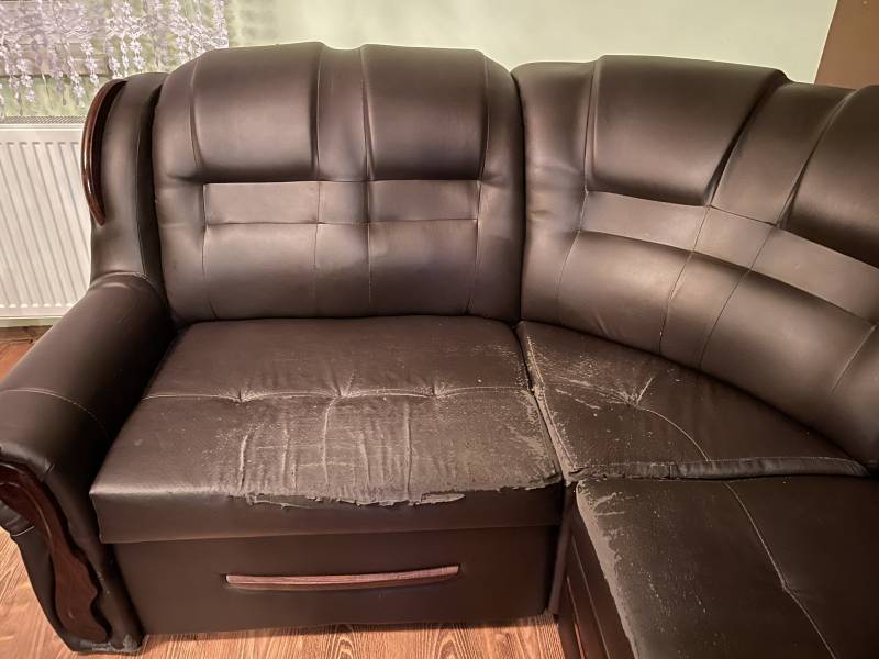 Stan wizualny: widoczne, wyraźne przetarcia i łuszczenie skóry na siedziskach oraz części narożnej (najbardziej eksploatowane miejsca). Boki i oparcia w lepszym stanie.