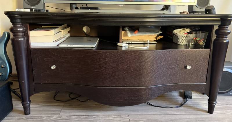 Solidna, drewniana komoda pod telewizor w ciemnym kolorze polskiej firmy Bydgoskie Meble. Posiada pojemną szufladę oraz otwartą półkę na dodatkowe akcesoria. Komoda jest w dobrym stanie, nadaje się do użytku w salonie lub pokoju telewizyjnym.