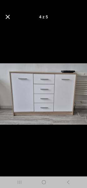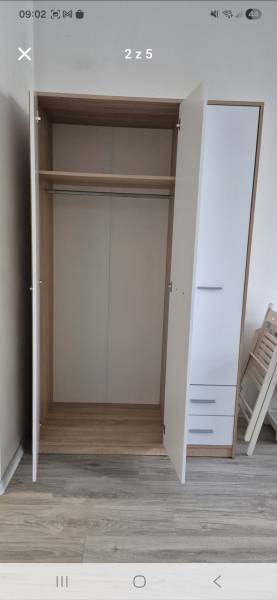 Komoda i szafa z Black Red White, dąb sonoma/biały, meble są w bardzo dobrym stanie. Szafa ma dwa drążki na ubrania dwie półki i dwie szuflady, komoda ma dwie szafki z półką i cztery szuflady.