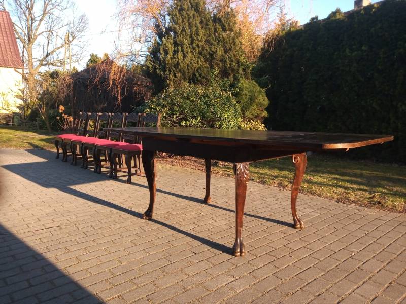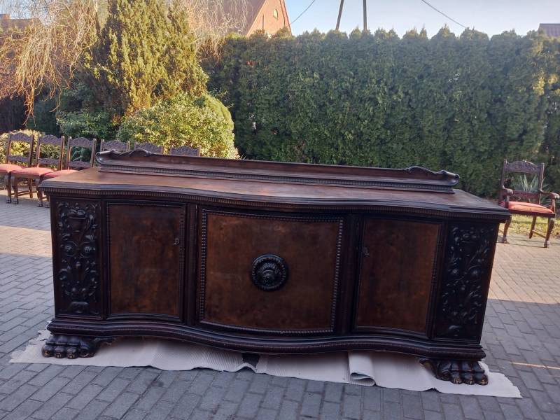 Stół +6 krzeseł, biurko +fotel, długa lada szafka z podajnikiem(2,8m), piękna witryna. Wszystko utrzymane w stylu mebli gdańskich, ciężkie meble na lwich łapach. W razie zainteresowania dysponuję zdjęciami