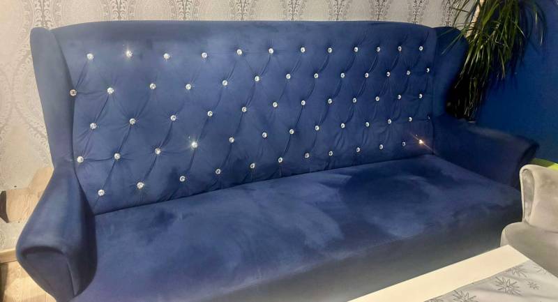 Sprzedam granatową sofę w stylu glamour, zdobioną kryształowymi guzikami.