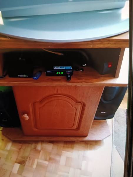 2) Stolik RTV wym. 74x45 wys.73. Z przodu dąb, boki płyta oklejona naturalną okleiną.