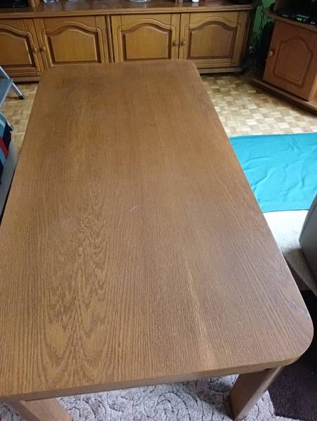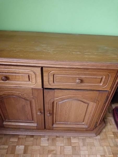 3) Komoda wym. 115x82. Z zewnątrz dąb , wewnątrz płyta oklejona naturalną okleiną.Blat wymaga renowacji.
