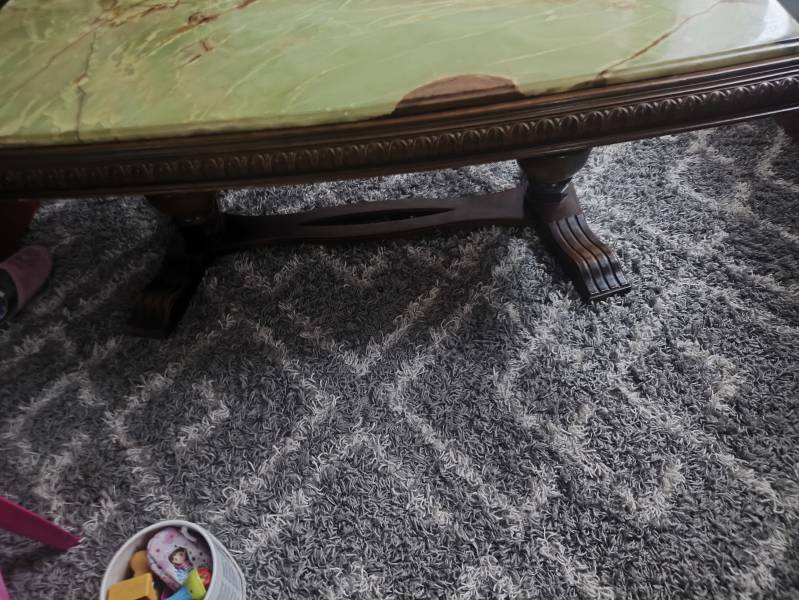 Stół drewniany z blatem z onyksu zielonego zadrapania na blacie oraz na ramie