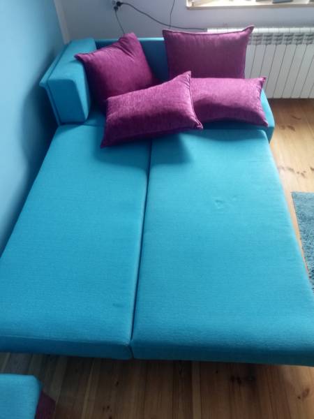 Narożnik z funkcją spania prawostronny z dwoma pufami. Narożnik ma wymiary 140X200 cm i jest koloru niebieskiego,w komplecie różowe poduszki nie przytwierdzone na stałe.