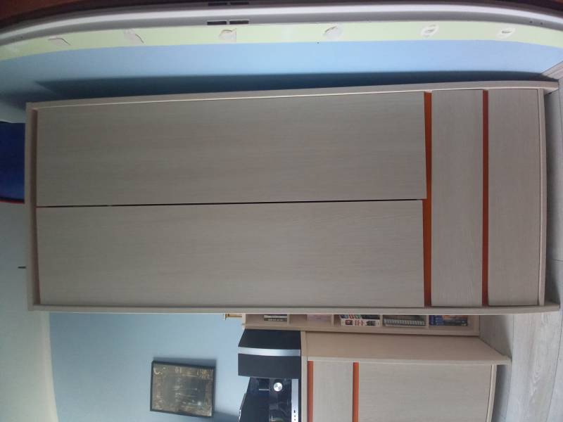 Zestaw mebli BRW numlock. Meble używane, stan dobry, w kolorze jasnego dębu belluno z pomarańczowymi listwami. Większe zużycie widoczne na wysuwanej półce biurka, gdzie odłamał się fragment drewna.