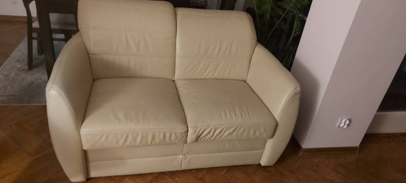 1 fotel sofa 2 osobowa i 3 osobowa z funkcją spania jasna akurat waniliowy sofy w stanie bardzo dobrym fotel w średnim widać ślady użytkowania na bokach